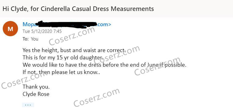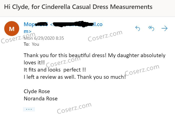 Clyde ordered custom-made Cinderella 2015 blue everyday dress in our store (https://www.coserz.com/) Then, our CoserZ team confirmed the measurements with her in time. We appreciated Clyde confirmed it ASAP.
