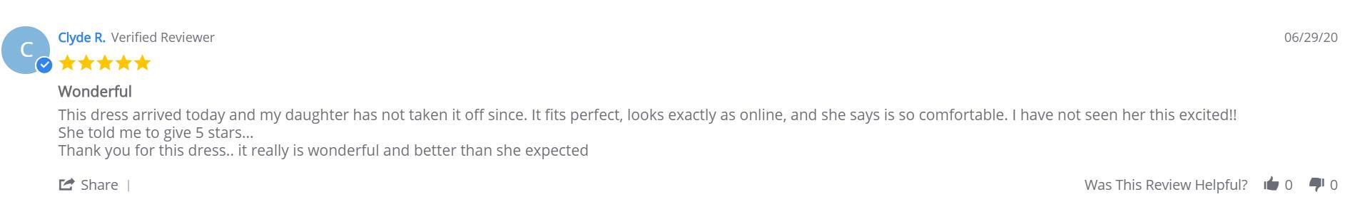 "This dress arrived today and my daughter has not taken it off since. It fits perfect, looks exactly as online, and she says is so comfortable. I have not seen her this excited!!